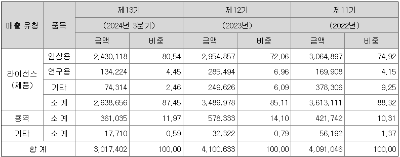 코어라인소프트의 매출은 임상용 제품, 라이선스(연구용, 기타), 용역, 기타로 구분됩니다. 2024년 3분기 기준으로 임상용 제품이 전체 매출의 80.54%를 차지하며, 회사의 주요 수익원으로 자리 잡고 있습니다. 연구용 라이선스와 기타 라이선스는 각각 4.45%와 2.46%를 차지하며, 용역 매출은 11.97%를 기록했습니다.