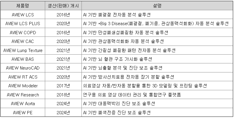 현재 이 회사의 대표적인 제품으로는 AVIEW LCS, AVIEW COPD, AVIEW CAC가 있습니다. 이 제품들은 흉부 CT 영상 분석을 통해 폐암(폐결절), 만성폐쇄성폐질환, 관상동맥석회화의 진단을 보조하는 솔루션으로, 의료진의 반복 작업 시간을 줄이고 진단 정확도를 높이는 데 기여하고 있습니다.