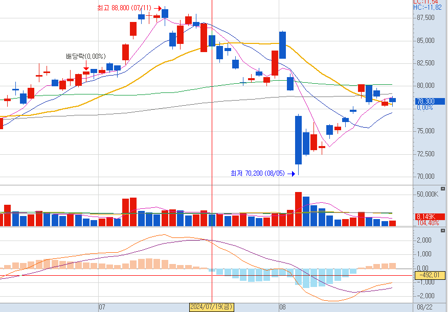 히스토그램이 양수에서 음수로 바뀌기 시작한 2024/07/19 차트입니다.