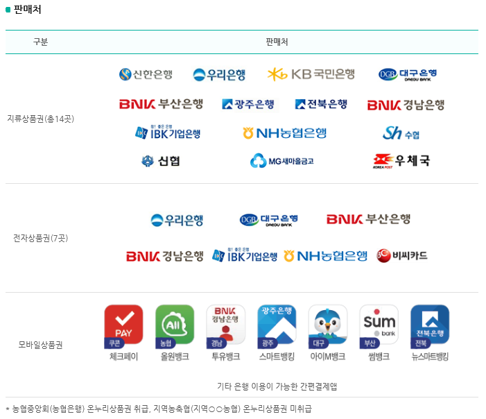 우선 종이 상품권을 구매할 수 있는 금융기관은 신한은행,우리은행,국민은행,대구은행,BNK부산은행,광주은행,전북은행, BNK 경남은행, IBK기업은행, NH농협은행, 수협, 신협, 새마을금고, 우체국으로 총 14곳입니다. 전자상품권 구매가 가능한 곳은 우리은행, 대구은행, BNK부산은행, BNK경남은행, IBK기업은행,농협은행,비씨카드로 총 7곳 입니다. 모바일상품권은 체크페이(쿠콘), 올윈뱅크(농협), 투유뱅크(경남), 스마트뱅킹(광주), 아이M뱅크(대구), 썸뱅크(부산), 뉴스마트뱅킹(전북) 으로 7곳이 있습니다. 결제수단의 경우 개인과 법인데 따라 다릅니다. 개인의 경우 신용카드는 사용이 불가하고 현금과 공무원 복지카드로만 결제가 가능합니다. 법인의 경우 현금과 법인카드로 종이상품권 구매가 가능하며,BC법인 포인트로 전자상품권을 구매할 수 있습니다. 하지만 판매지점마다 법인카드와 공무원 복지카드의 사용 가능 여부가 다르기 때문에 방문 전 전화문의 혹은 홈페이지 방문을 통해 확인하시기 바랍니다. (신분증 제시는 필수 , 대리구매 불가능)